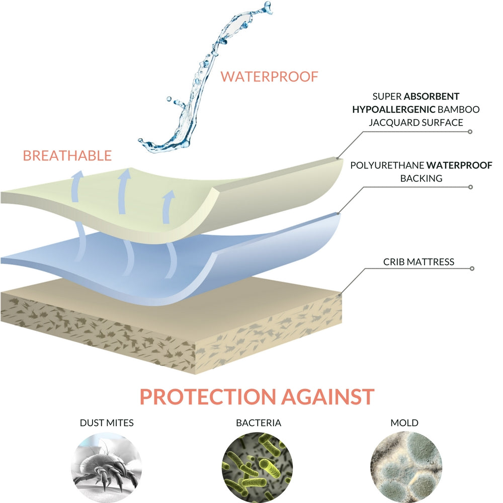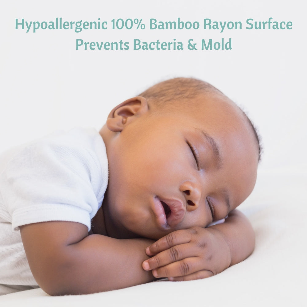 - PERFECTLY SAFE FOR YOUR BABY: Your baby’s health comes first and this is why we make sure that no dangerous chemicals are used on the soft crib mattress cover. The unbleached protector is naturally white and it’s made with eco-friendly bamboo fabric that is hypoallergenic and anti-bacterial