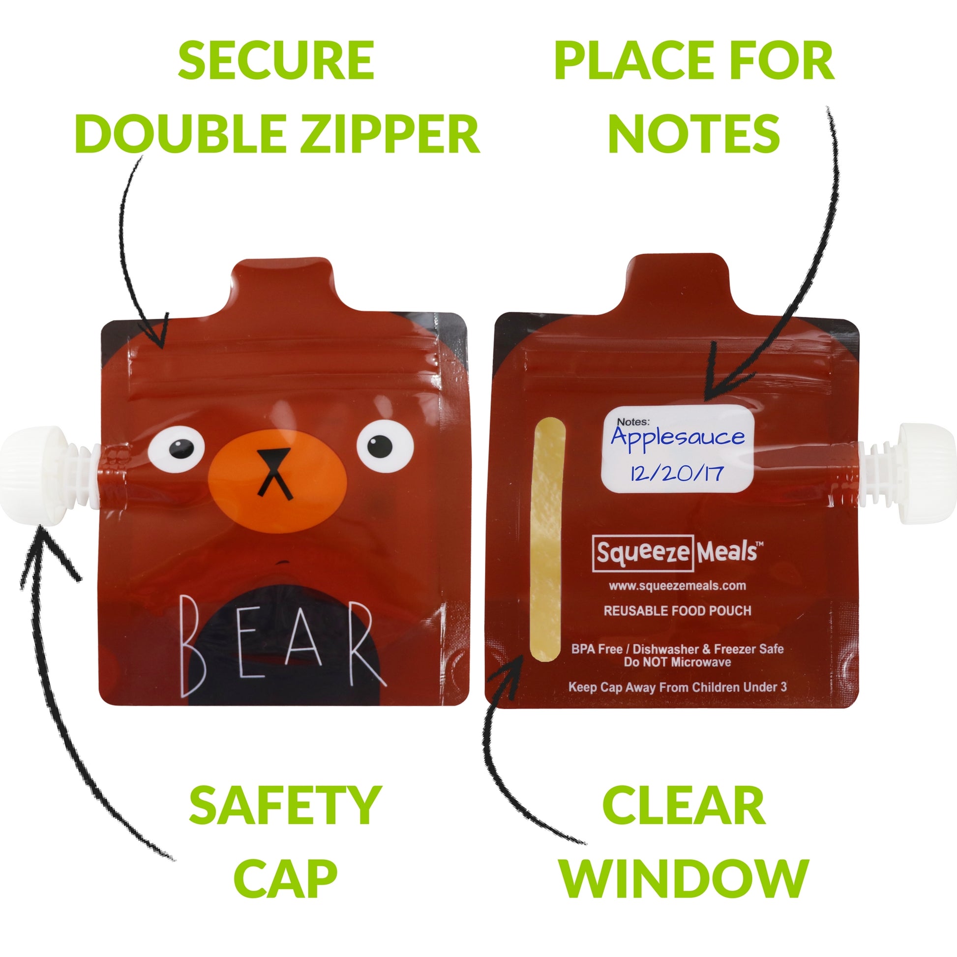- EASY TO FILL AND WASH: SqueezeMeals’ wide and leak-proof resealable double zipper opening on the top makes it easy to fill each pouch with fruit and veggie puree yogurt smoothie or applesauce. Depending on the content you can pour or just use an ordinary spoon to fill up a pouch. It is not necessary to use a filling station. Wash it with warm soapy water or put it on the top rack of a dishwasher. For best results, we recommend rinsing used food pouches before loading it in a dishwasher. Air dry.