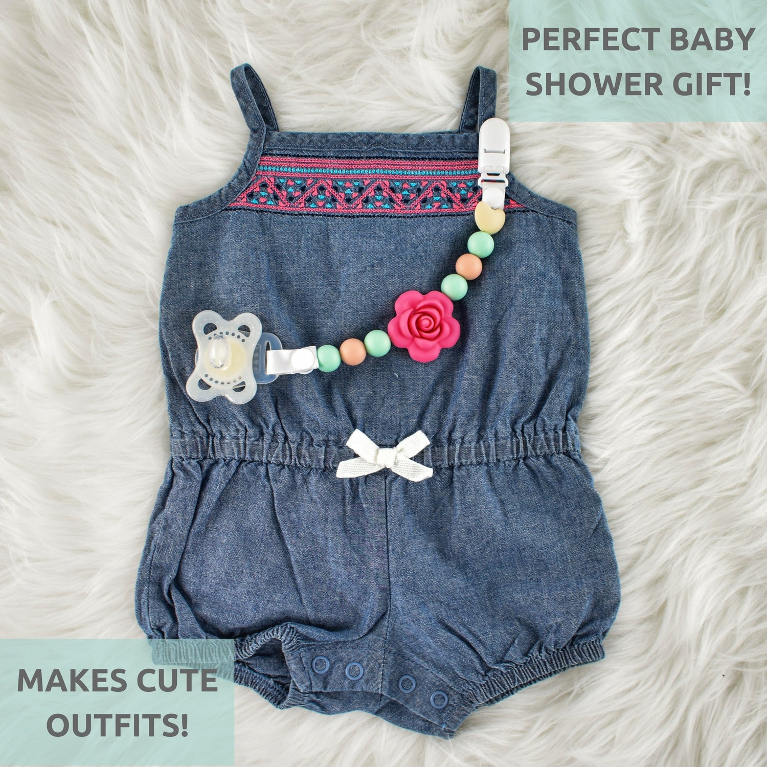 - INCREDIBLE BABY SHOWER GIFT: Every expecting or new parent of a newborn or teething baby girl will like this amazing floral dummy holder set! It comes in a beautiful gift box so it will make a perfect baby shower gift. Get this pretty petal pacifier holder set for your friend, daughter or sister and rest assured that she will absolutely love it!