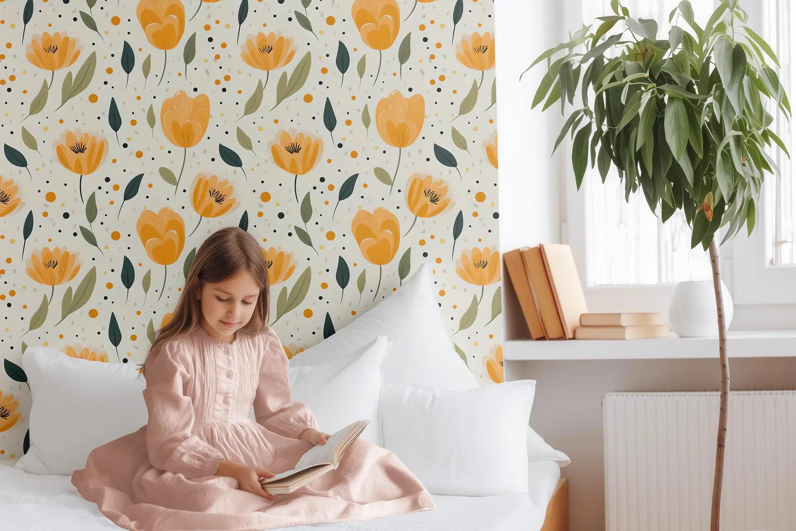 Yellow Tulip Pattern Wallpaper | Floral Spring Wallpapers | Peel & Stick Wallpaper, Removable and Renter Friendly | Girls Room